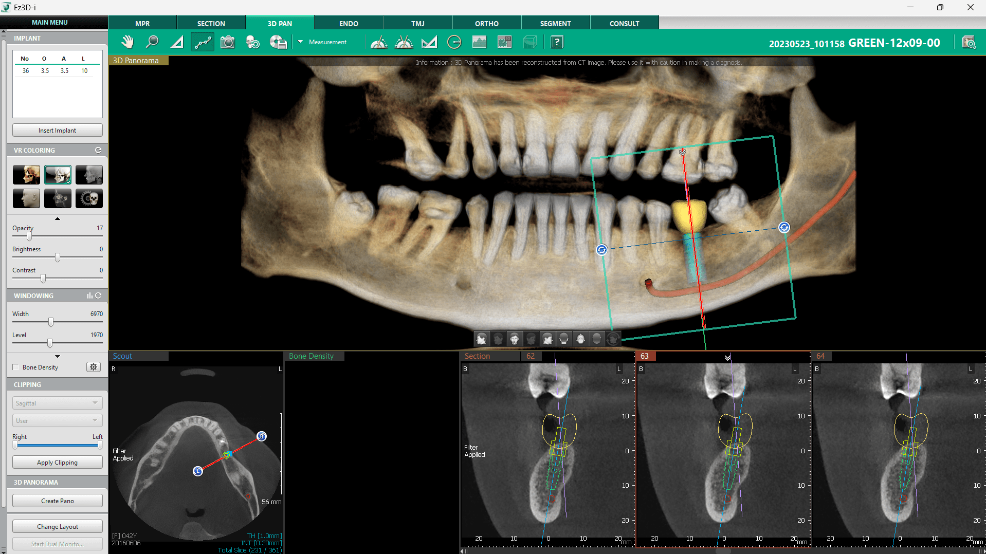 Localizarea canalului mandibular este esențială pentru stabilirea unei abordări corecte în planificarea implanturilor. Software-ul Ez3D-i oferă mai multe metode pentru marcarea acestuia în imaginile 3D, iar utilizarea 3D PAN reprezintă una dintre cele mai rapide și eficiente modalități. Combinarea 3D Navigator cu imaginea panoramică 3D, generată dintr-o scanare CT, oferă o modalitate rapidă de a naviga prin secțiuni și de a localiza canalul.