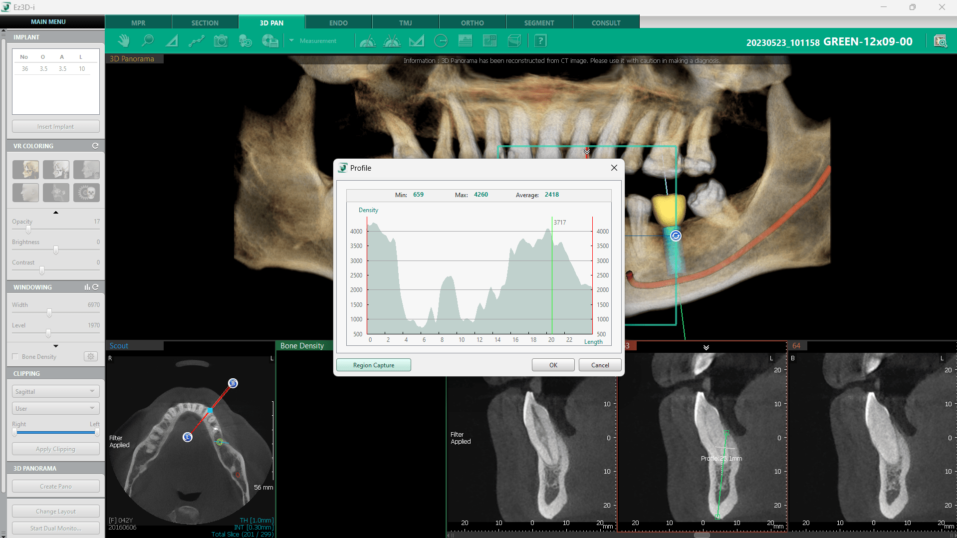 Densitatea osoasă joacă un rol crucial în integrarea implantului și în succesul său pe termen lung, motiv pentru care este esențial să fie analizată cu atenție înainte de intervenție. Software-ul Ez3D-i oferă mai multe instrumente pentru evaluarea densității osoase, printre care profilul osos, suprapunerea densității osoase și analiza zonei de interes (ROI), despre care vom discuta mai jos.