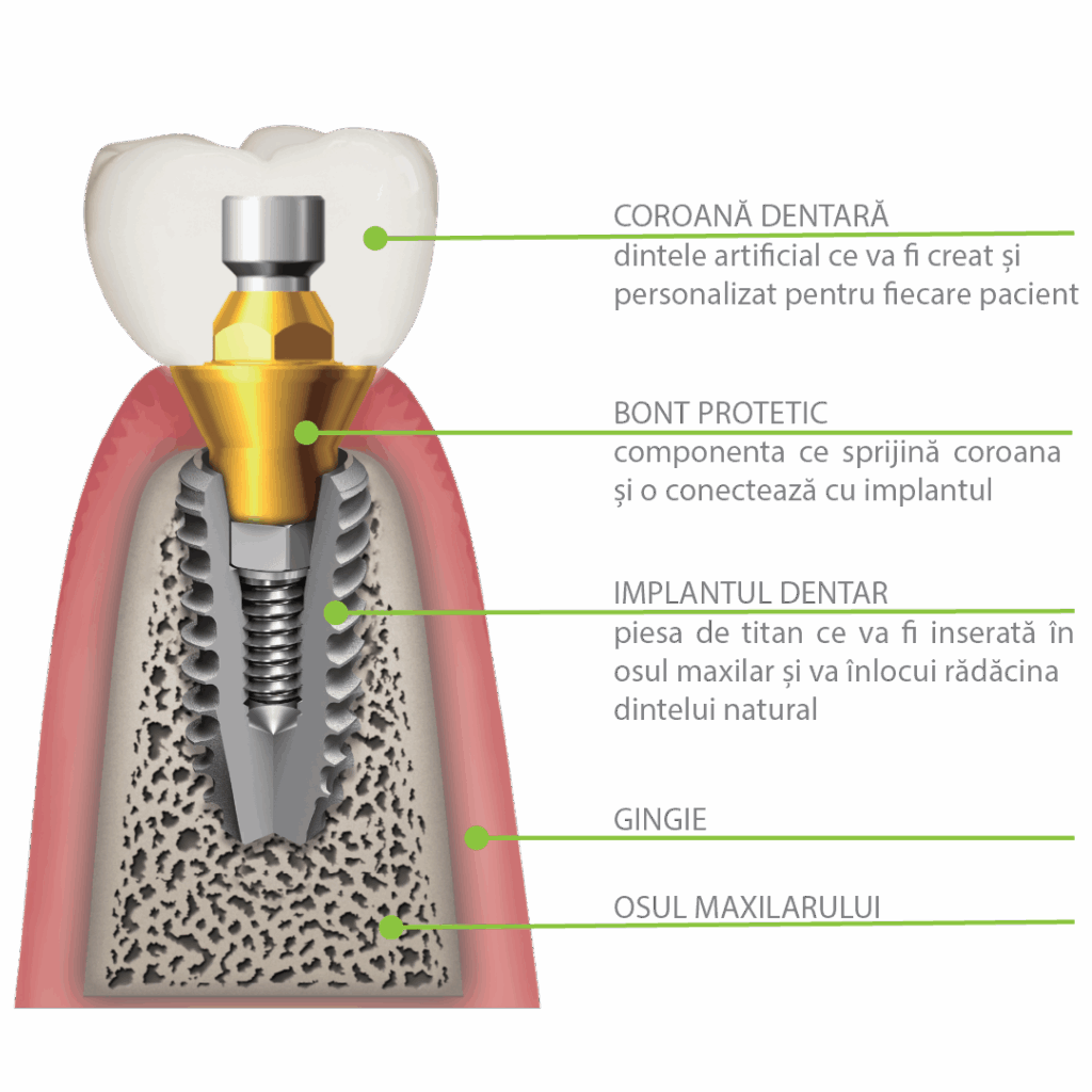 Implantul Dentar: confecționat din titan biocompatibil și durabil, permite integrarea solidă în țesutul osos prin intermediul procesului de osteointegrare. Este inserat chirurgical în osul maxilar sau mandibular și acționează ca o rădăcină artificială, oferind suport robust pentru celelalte componente.