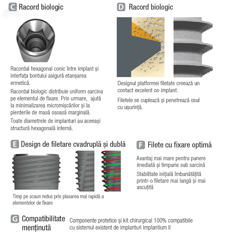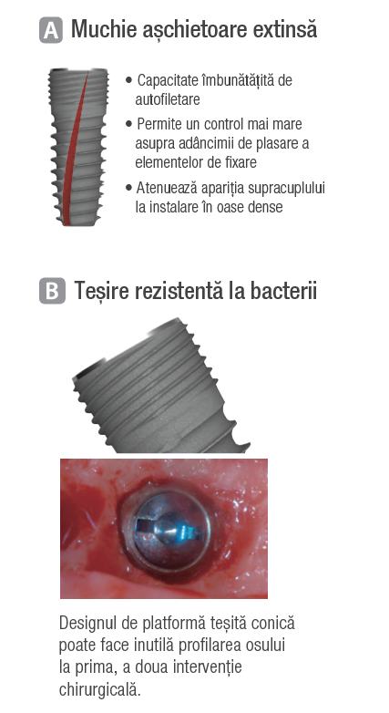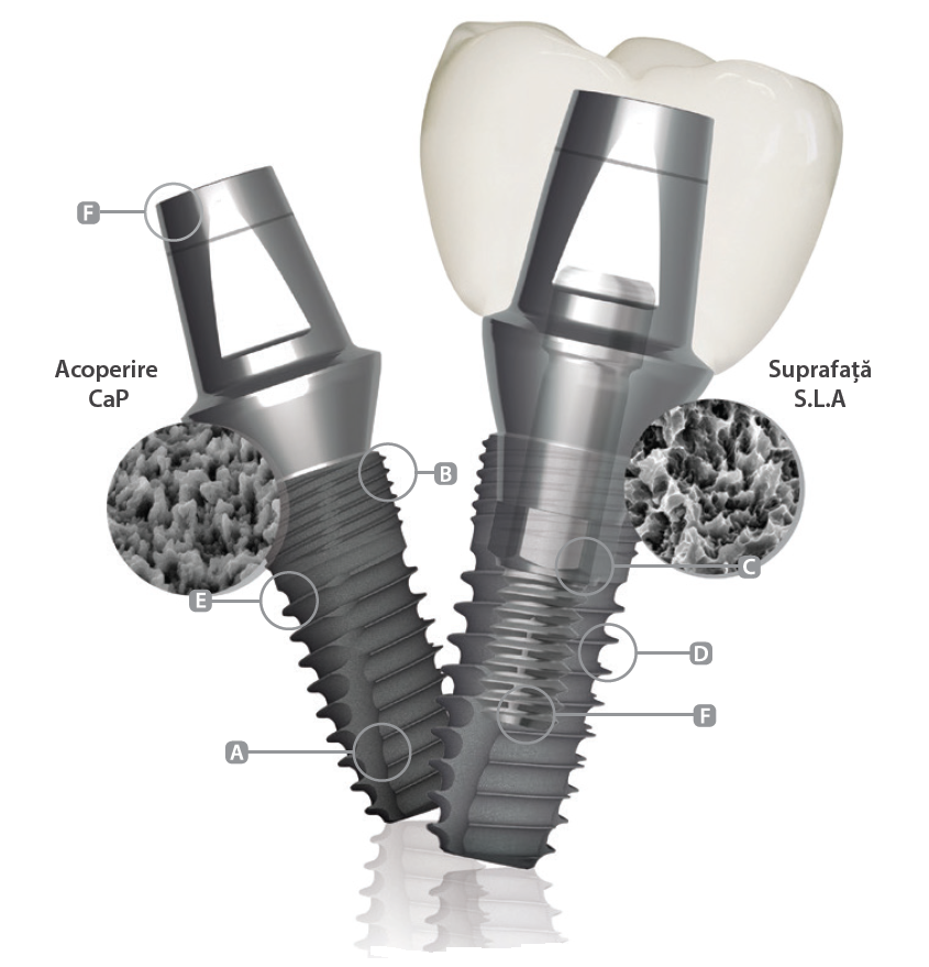 Sistemul Implantium stă la baza dezvoltării SuperLine și își dovedește încă eficiența prin caracteristicile sale specifice. Implant dentar Implantium de la Dentium, cu muchie așchietoare extinsă, teșire rezistentă la bacterii și acoperire CaP. Racordul hexagonal conic între implant și interfața bontului asigură etanșarea ermetică și distribuie uniform sarcina pe elementul de fixare, ajutând la minimalizarea micromișcărilor și a pierderilor de masă osoasă marginală.
