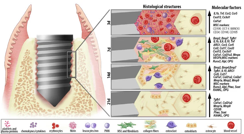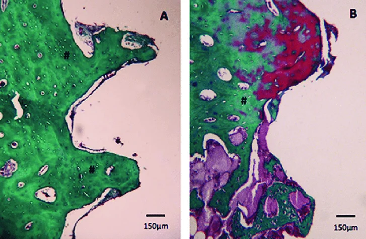 Pentru a explica observația experimentală, echipa lui Brånemark a inițiat studii histologice detaliate. Analiza microscopică a evidențiat existența unui contact structural și funcțional direct între țesutul osos vital și suprafața de titan, fără interpunerea unui țesut conjunctiv fibros. Acest tip de interfață contrazicea modelele biologice acceptate la acel moment, care presupuneau inevitabil formarea unui strat fibros în jurul materialelor implantate.