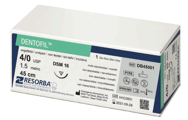 Firul de sutură DENTOFIL DB45001 este un fir monofilament neresorbabil fabricat din politetrafluoroetilenă (PTFE), cunoscut pentru proprietățile sale de rezistență și durabilitate. Acesta este de culoare albă, cu grosime 4/0 și lungimea de 45 cm, fiind prevăzut cu un ac DSM16. Firul de sutură este utilizat în proceduri de chirurgie orală și maxilo-facială, având o suprafață extrem de netedă, care reduce frecarea cu țesutul și previne traumatismele tisulare. De asemenea, acest fir limitează riscul de contaminare bacteriană datorită structurii sale monofilamentare, care împiedică infiltrarea bacteriilor în zona chirurgicală. Firul DENTOFIL este ideal pentru închiderea rănilor post-implant sau grefe osoase.