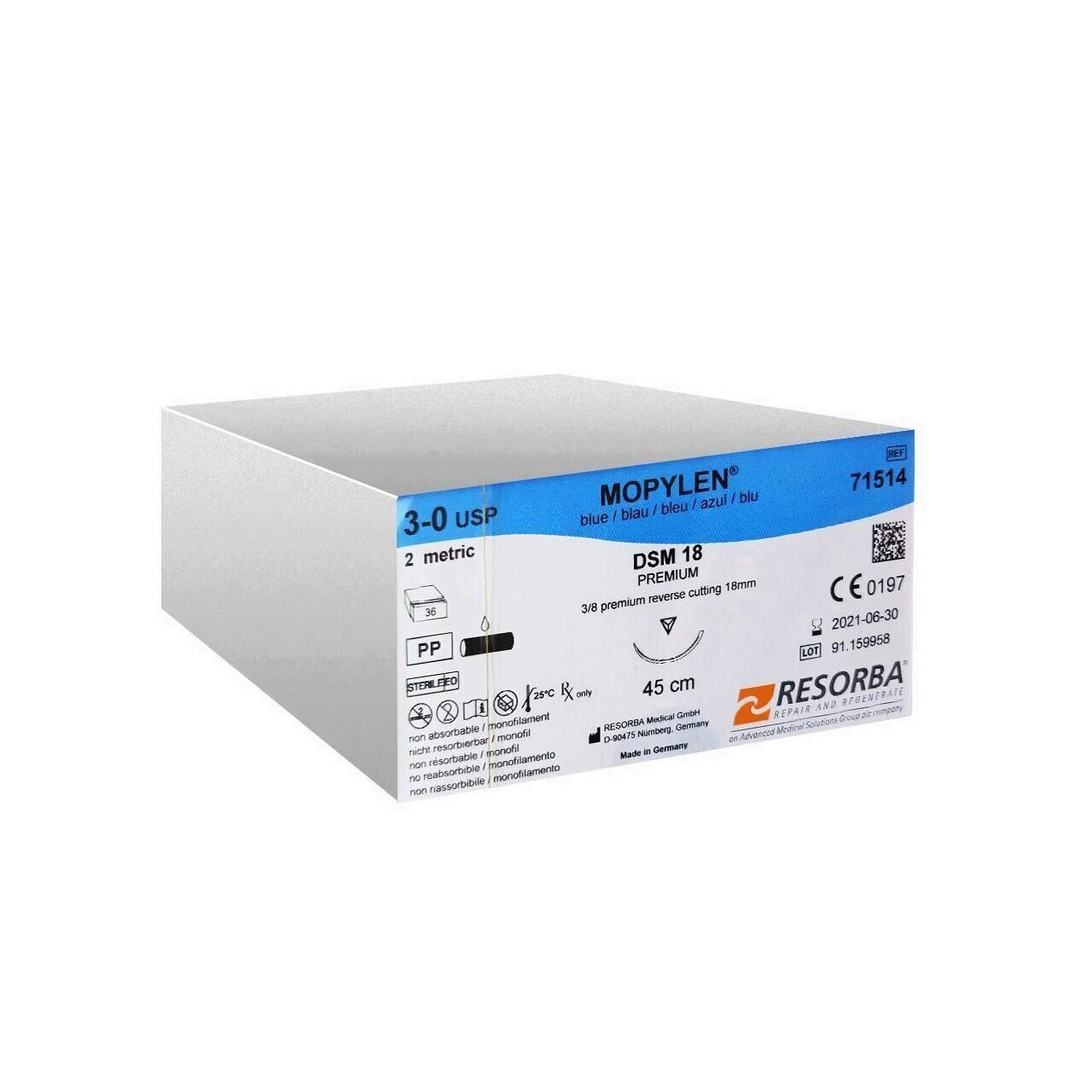 Firul de sutură MOPYLEN 71514 de la Resorba, din polipropilenă neresorbabilă și de culoare albastră, oferă durabilitate și vizibilitate superioară pentru diverse aplicații chirurgicale. Ideal pentru intervenții care necesită fixare pe termen lung.