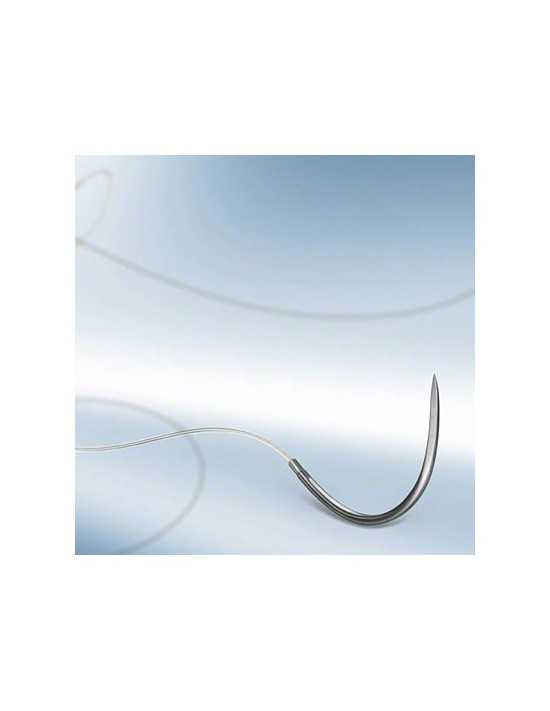 • Ac atașat: DS12 – ac triunghiular cu vârf ascuțit, curbura 3/8 și lungime de 12 mm, oferind o penetrare precisă și ușoară în țesuturi.