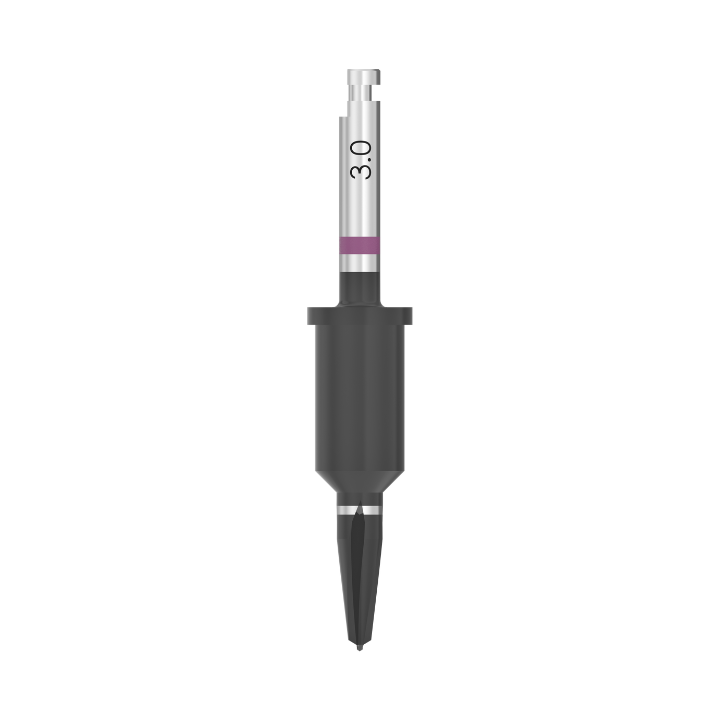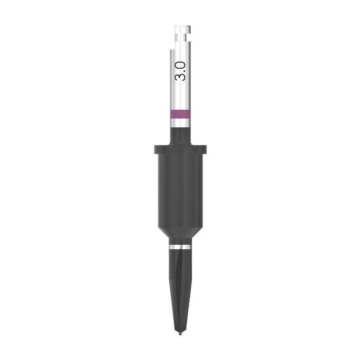 Freza realizează osteotomia conică primară, cu diametrul de 3 mm, asigurând ghidaj axial precis și control dimensional al adâncimii de foraj.