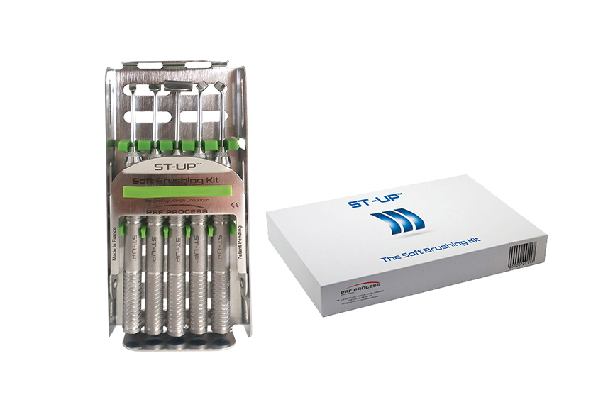 Soft Brushing Box – Kit Perii PRF este un set de 5 perii din oțel inoxidabil, utilizate pentru extinderea atraumatică a lamboului în proceduri dentare și PRF, fără incizii.