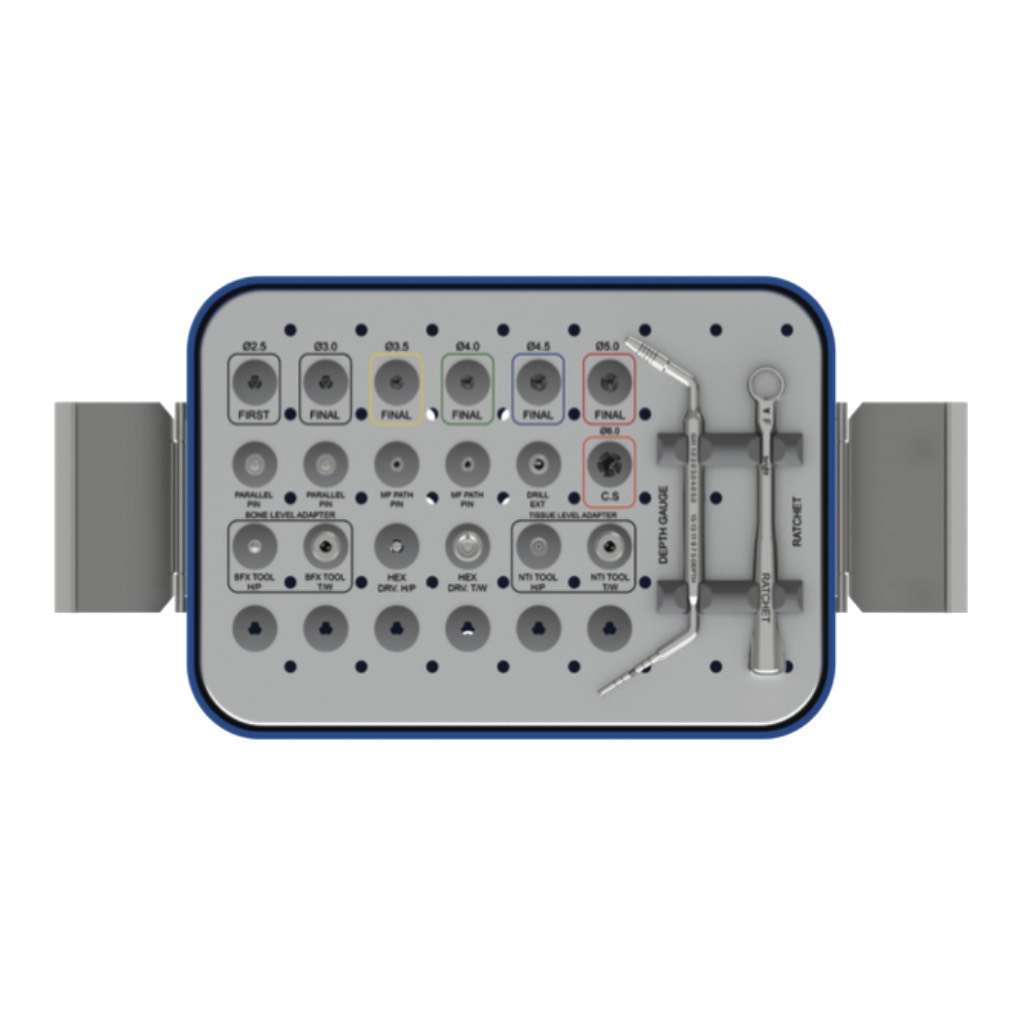 - Instrumente auxiliare: Set complet ce include pini de paralelism, pini de traiectorie, extensii de freze, sonde de adâncime și diverse adaptoare specifice sistemelor Bone-Level sau Tissue-Level.